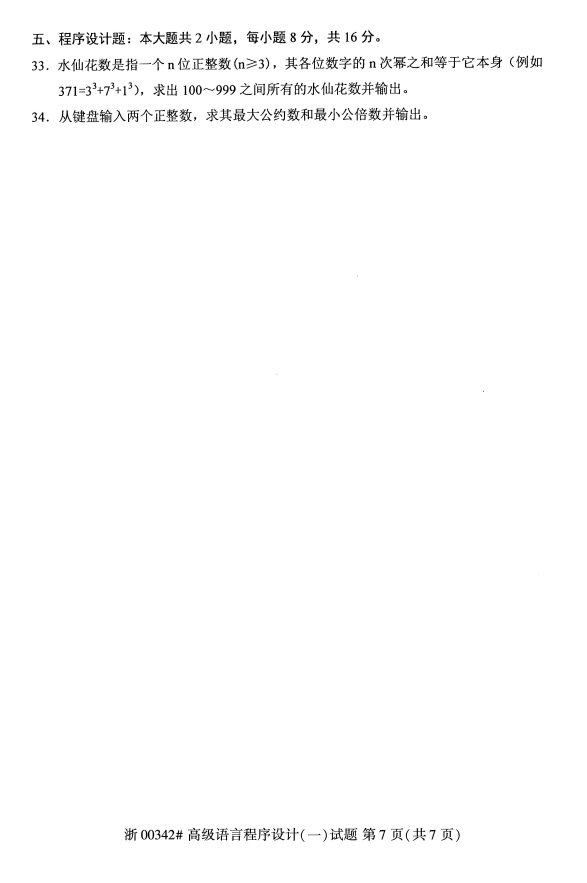 全國(guó)2019年10月自考00342高級(jí)語(yǔ)言程序設(shè)計(jì)(一)試題